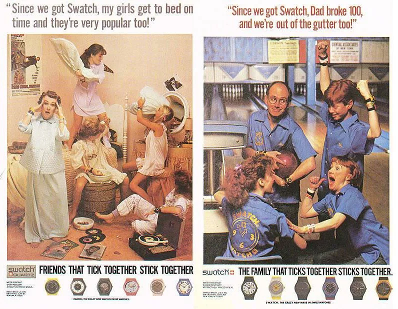 (Top to bottom): Herbert Matter’s Swiss tourism poster on the left, Paula Scher’s pardy poster for Swatch on the right; A print ad series for Swatch