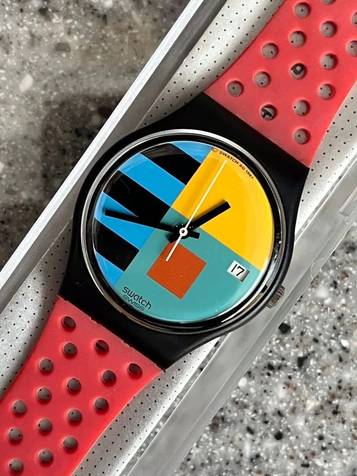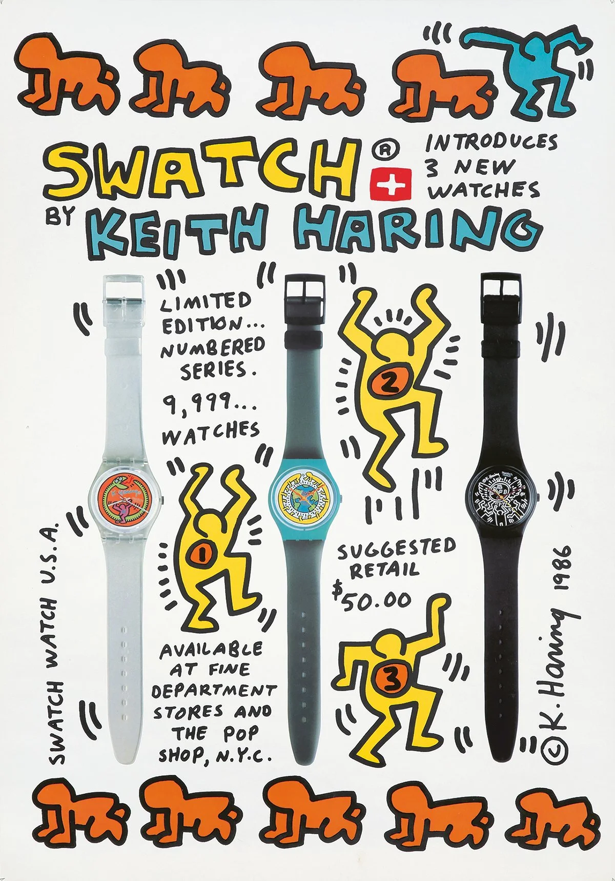 (Top to bottom): An early Swatch showing some of the design elements that made them must-have fashion accessories, a Swiss tourism poster on the left and a Swatch homage to that poster from designer Paula Scheer, a print advertisement for a line of Swatch watches featuring artwork from Keith Haring